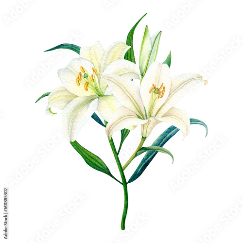 Fototapeta premium Delicate watercolor white lily with green leaves