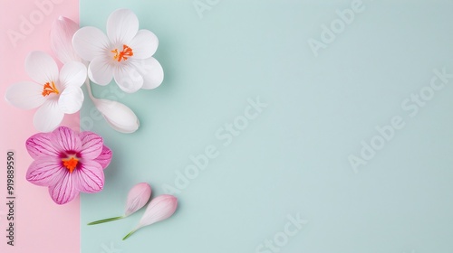 © Photopia, Naklejka premium Delicate White and Pink Crocus Flowers on Pastel Background - Minimalistic Floral Arrangement with Copy Space for Text - Perfect for Web Banners, Marketing Materials, Invitations, and Spring or Summer