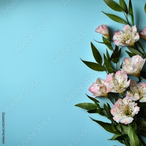 © BOJOShop, Fototapeta premium Delicate White and Pink Flowers on a Light Blue Background