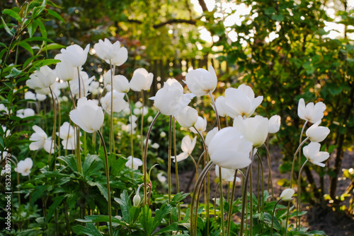 © sanchopancho, Obraz premium Delicate white Anemone flowers blooming under warm sunlight with a gentle bokeh background.