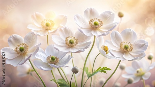 © Four888, Obraz premium Delicate white anemone flowers with tender petals and slender stems sway gently in a whimsical dance against a soft, serene, creamy background.