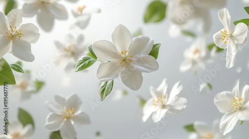 © Іван Ніколов, Obraz premium Delicate white apple blossoms and green leaves on a soft background