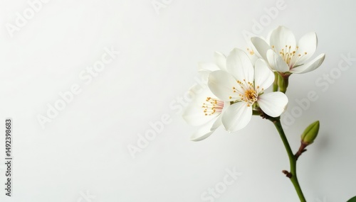 Fototapeta premium Delicate white blossom against pure white backdrop, minimalism, plant, botany