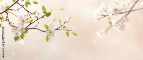 © Ardi, Fototapeta premium Delicate white blossoms adorn a branch, a subtle dance of nature against a soft, dreamy backdrop.