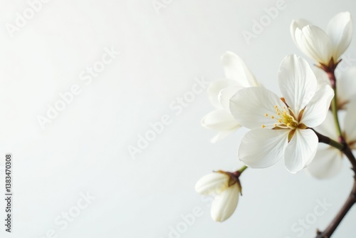 Fototapeta premium Delicate white blossoms against a pure white background, minimal, close-up,...