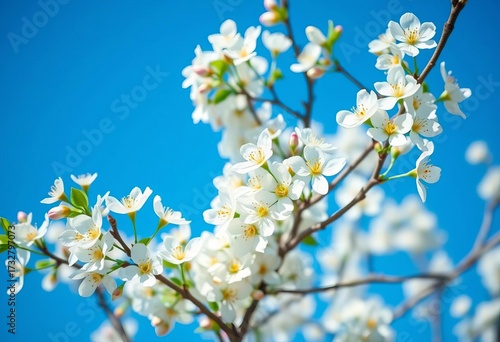 Obraz premium Delicate white blossoms against a vibrant blue sky; ample copy space...