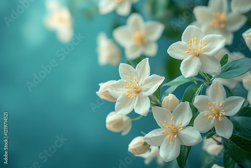 © Myartsam Design, Fototapeta premium Delicate White Blossoms Against Teal Background