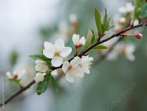 © Your Stocks , Obraz premium Delicate white blossoms glistening with raindrops a serene spring scene in soft natural light