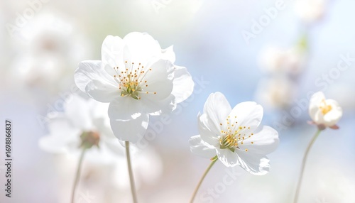 © Raba, Obraz premium Delicate white blossoms in soft focus, showcasing the beauty of springtime in a gentle, ethereal light.