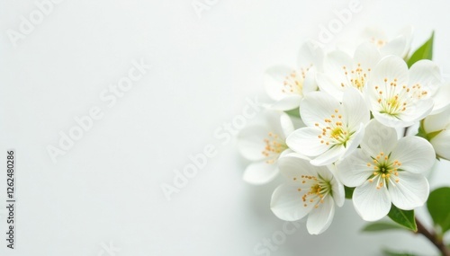 © Theerawat, Fototapeta premium Delicate white blossoms & leaves on pure white backdrop, wedding, high key, photography