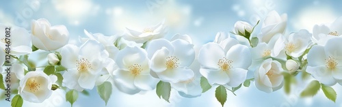 Obraz premium Delicate white blossoms on a branch against a soft blue background.