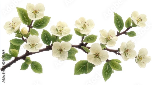 © Nest, Fototapeta premium Delicate white blossoms on a branch with green leaves, showcasing spring's beauty in nature