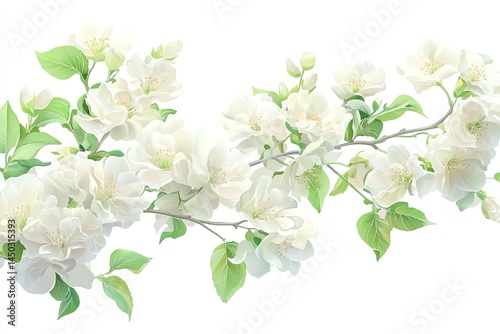 © Ruslan, Fototapeta premium Delicate white blossoms on a curving branch, lush green leaves