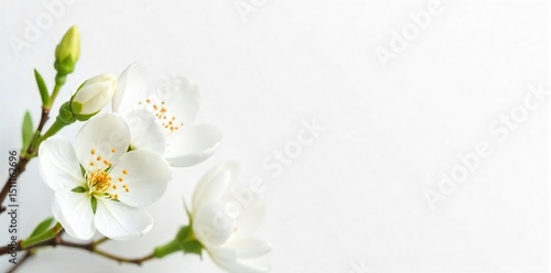 © Wannisa, Obraz premium Delicate white blossoms on a pure white background, symbolizing springtime freshness and new beginnings Perfect for spring themes, Easter, wedding invitations, and more , spring, invitation, easter