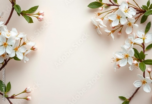 Obraz premium Delicate white blossoms softly frame a light beige textured background,...