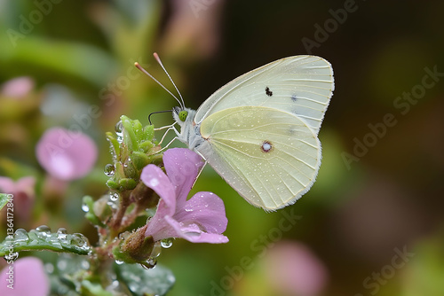 © Muhammad, Naklejka premium Delicate white butterfly resting on a vibrant pink flower in a natural garden