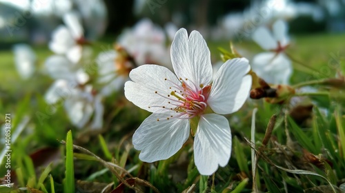 Fototapeta premium Delicate white cherry blossoms bloom in a grassy field.