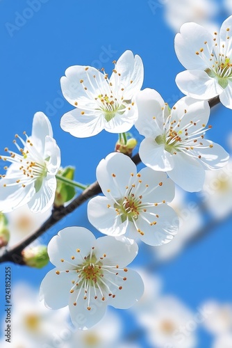 Obraz premium Delicate White Cherry Blossoms in Full Bloom Against a Vivid Blue Sky, Spring...