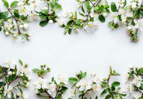 Fototapeta premium Delicate white cherry blossoms with green leaves arranged on a light background