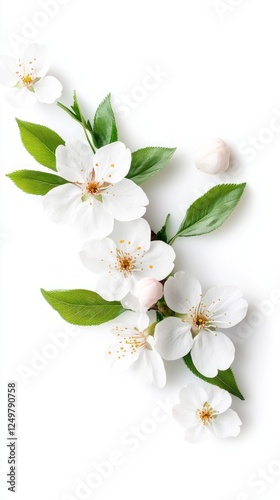 © laperuz, Fototapeta premium Delicate white cherry blossoms with green leaves on a bright background