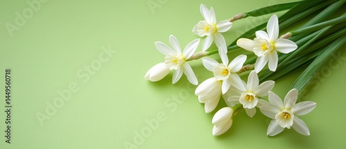 © Tam5, Obraz premium Delicate White Daffodils on Light Green Background with Copy Space for Springtime Greetings