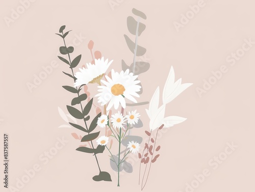 © Sukifli Dakheng, Naklejka premium Delicate white daisies and eucalyptus leaves on a soft pink background.