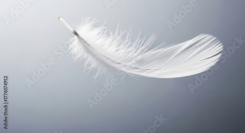 Obraz premium Delicate white feather floating gently against a soft gray background,...