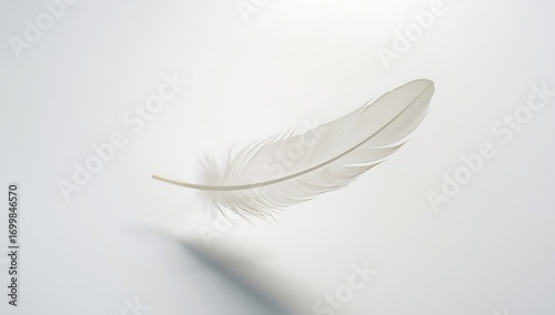 Obraz premium Delicate white feather floating gently with soft shadow on a clean white...