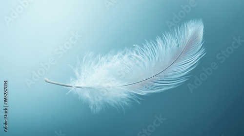 Obraz premium Delicate white feather floating on soft blue background