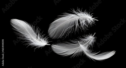 Obraz premium Delicate White Feathers Floating Against a Deep Black Background, Artistic...