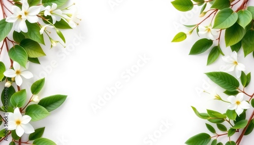 Naklejka premium Delicate white floral frame with lush green leaves on pure white background, design, botanical