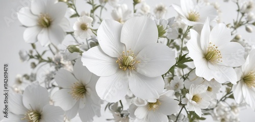 © Sayfar, Fototapeta premium Delicate white floral print on white background, spring, close-up, foliage