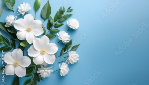 Fototapeta premium Delicate White Flower Arrangement On Soft Blue Background
