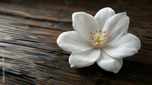 Fototapeta premium Delicate white flower rests on weathered wooden planks.