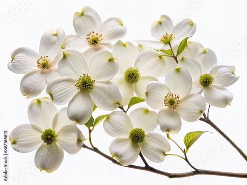 © Four888, Fototapeta premium Delicate white flowering dogwood blossoms bloom on a curved branch isolated against a pure white background, showcasing nature's beauty with intricate details.