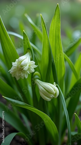Fototapeta premium Delicate white flowers and vibrant green foliage in a garden setting