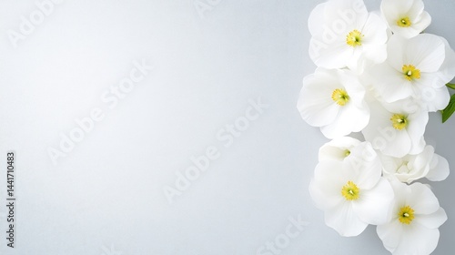 © Bella, Fototapeta premium Delicate white flowers arranged on a light gray background. Soft and elegant floral display