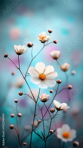 © Amron, Fototapeta premium Delicate white flowers bloom against a soft, teal backdrop