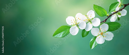 Fototapeta premium Delicate white flowers blooming on green background