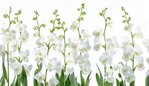 © Riz, Fototapeta premium Delicate White Flowers Blooming with Green Stems Isolated on White Background Beautiful Blossoms Detailed Petals Springtime Freshness Pure Elegance Botanical Still Life