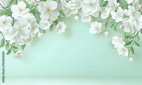 © Chantanapa, Fototapeta premium Delicate White Flowers Frame on Soft Mint Background for Design