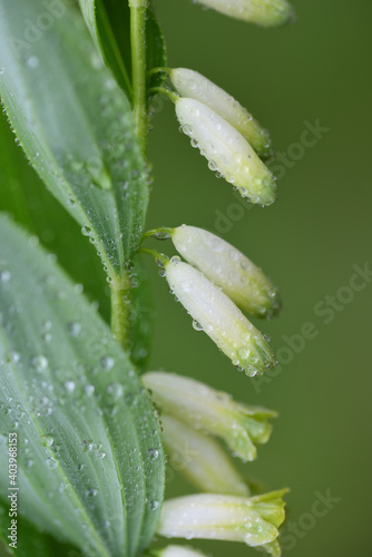 © leopictures, Fototapeta premium Delicate white flowers hang from a Solomon's seal or white spice (Polygonatum officinale Moench) and are covered with water droplets, in portrait format