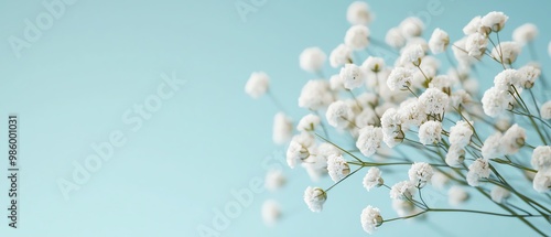 Fototapeta premium Delicate white flowers on a soft blue background, perfect for backgrounds, invitations, or botanical themes.