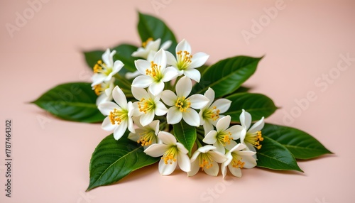 © Napapat, Obraz premium Delicate White Flowers with Green Leaves Arranged on Soft Pink Background for Natural Beauty and Floral Design Inspiration