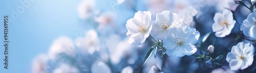 Fototapeta premium Delicate white flowers with soft blue background.