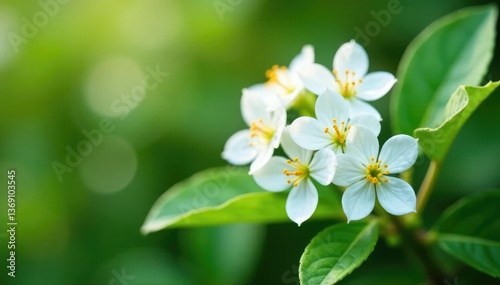 © Kingphet, Fototapeta premium Delicate white flowers with yellow pollen on a bush, europe, white flowers