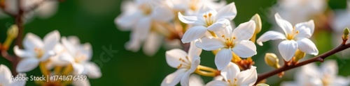 © dadtophoto, Fototapeta premium Delicate white jasmine blossoms unfurl in the soft spring light, their petals pristine against a blurred green background, delicate, flora