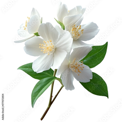 © Israt, Obraz premium Delicate white jasmine flowers with green leaves isolated on a solid background