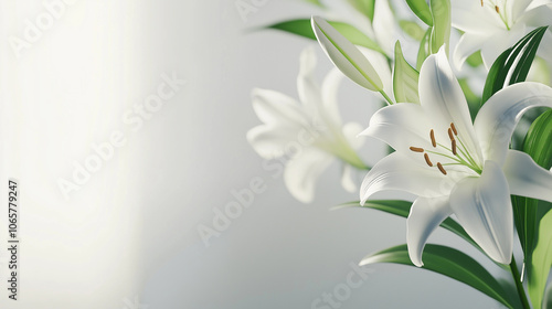 Fototapeta premium Delicate white lilies arranged on a soft background, symbolizing purity and elegance.