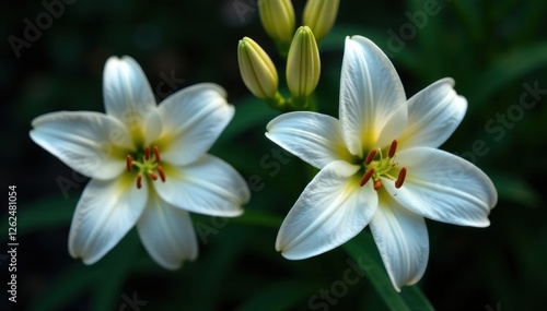 Fototapeta premium Delicate white lilies, vibrant stamens, dark backdrop , high resolution, floret, spring